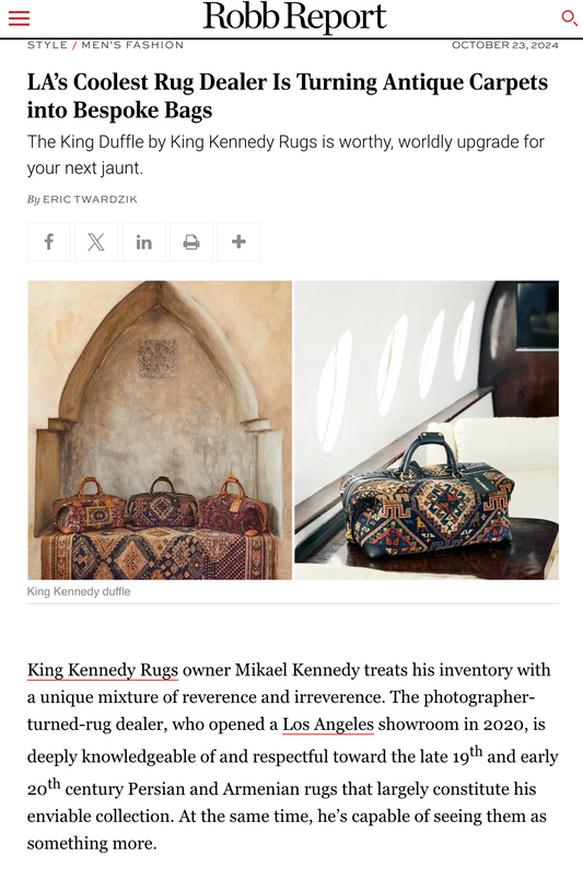 " LA’s Coolest Rug Dealer Is Turning Antique Carpets into Bespoke Bags The King Duffle by King Kennedy Rugs is worthy, worldly upgrade for your next jaunt.