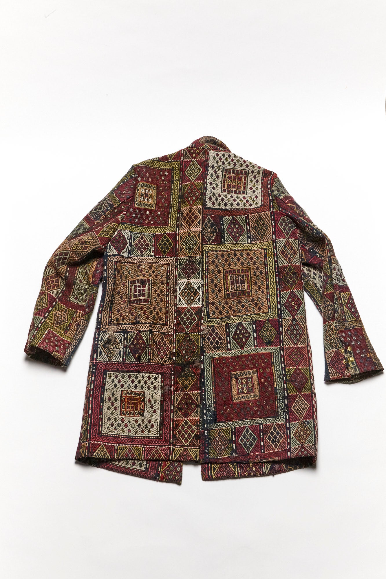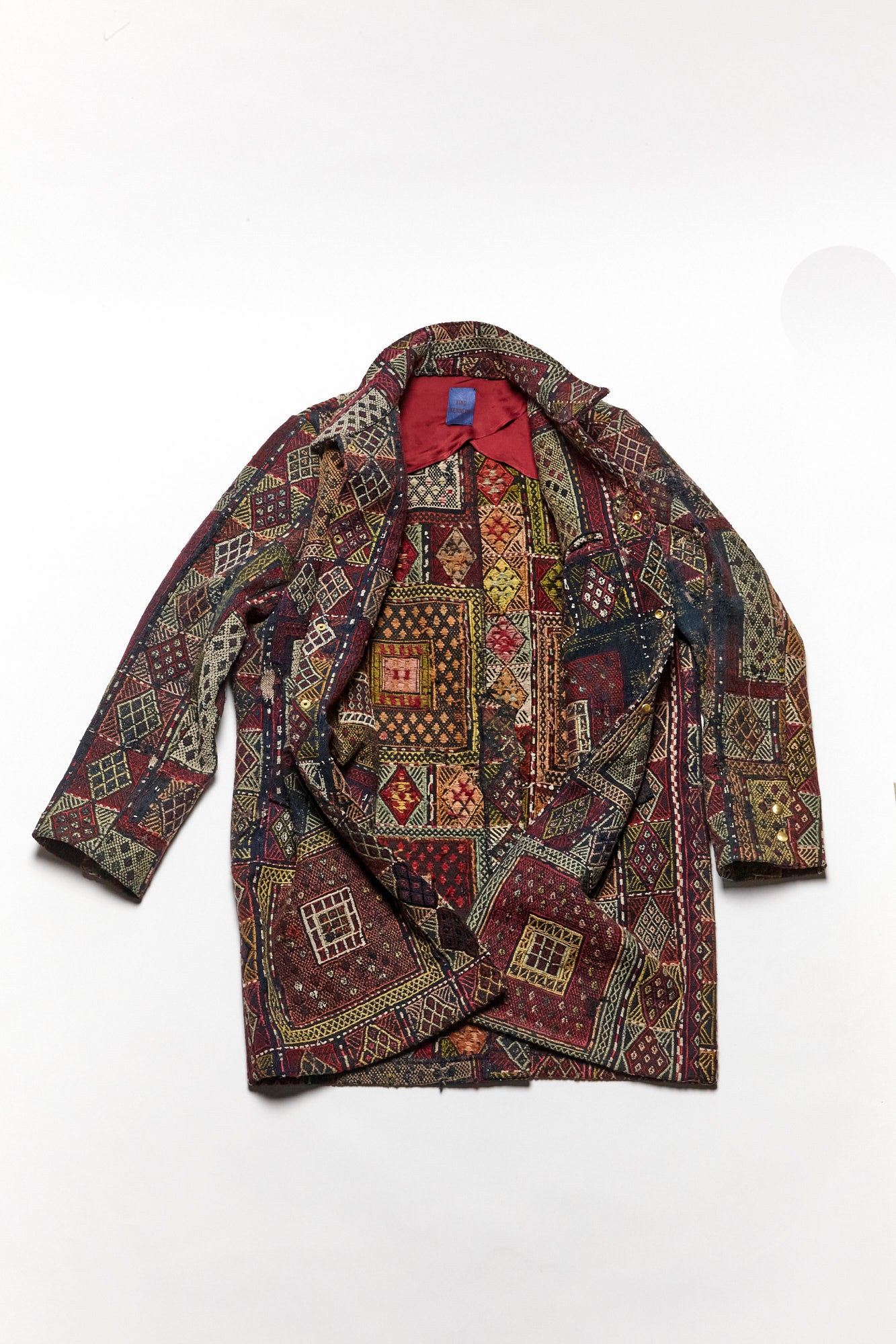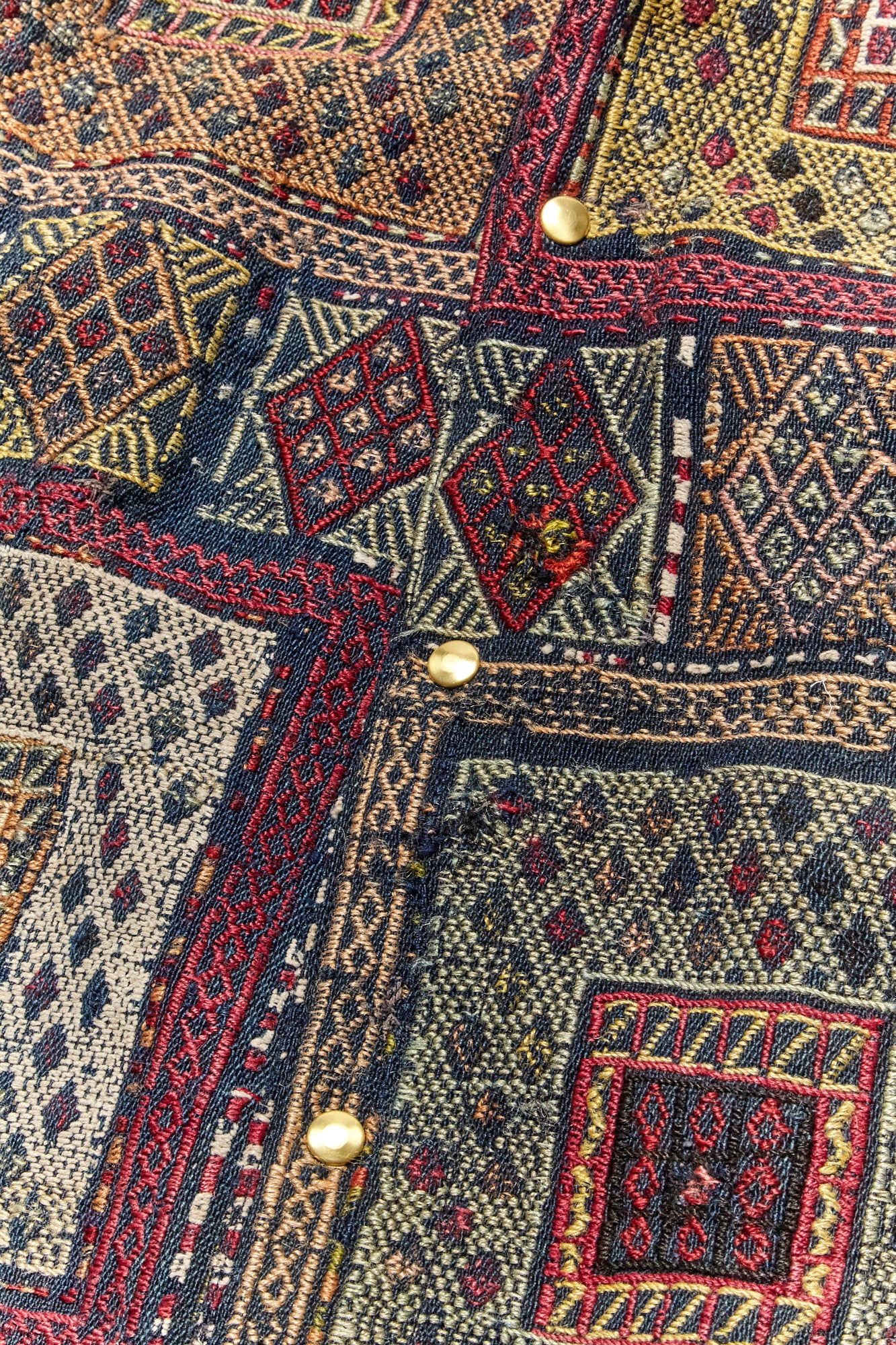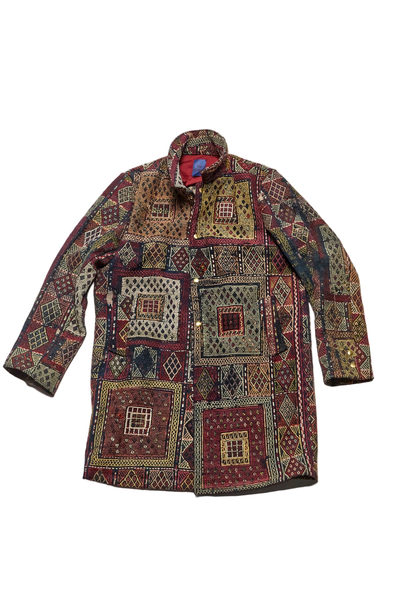 Constructed from an antique rug woven in the early 1900’s and lined with dead stock silk. 3 Pockets, antique brass snap closure.
