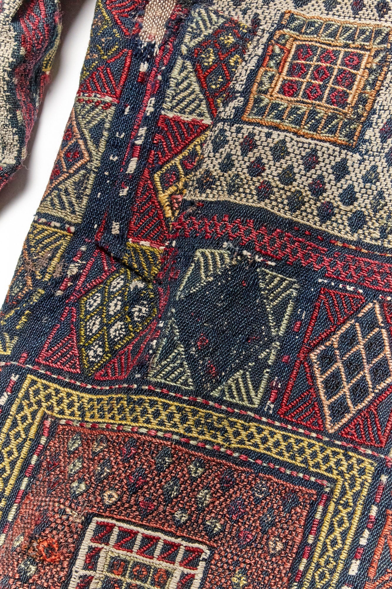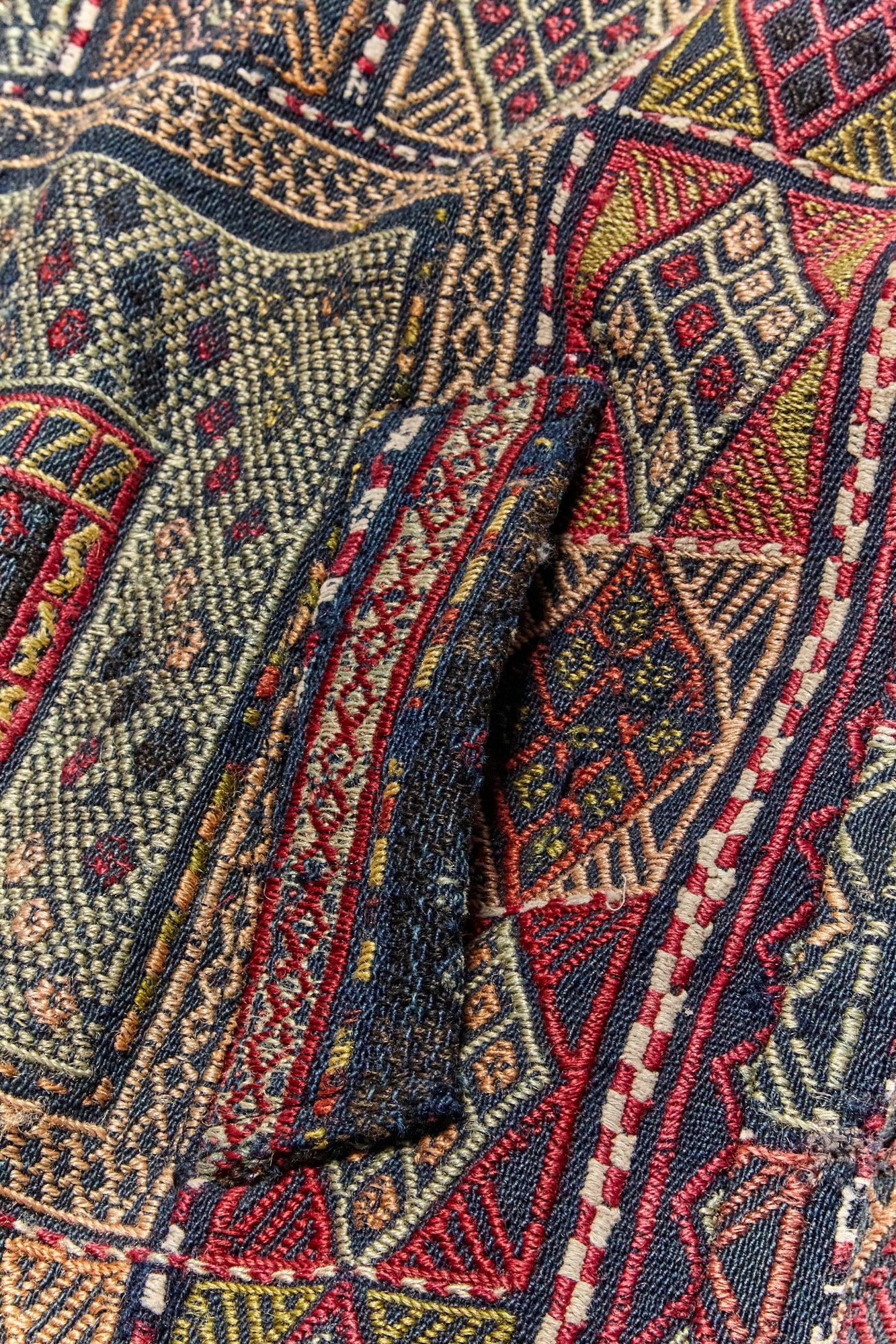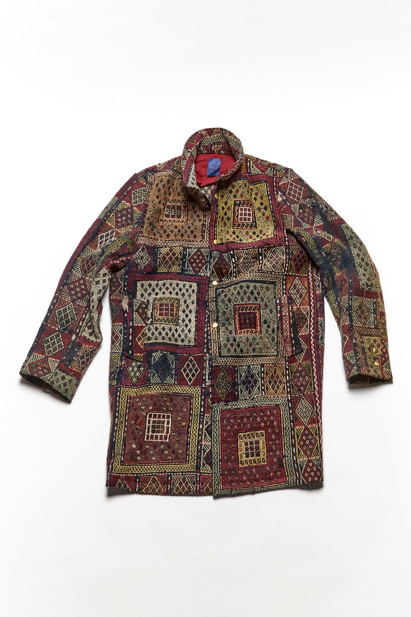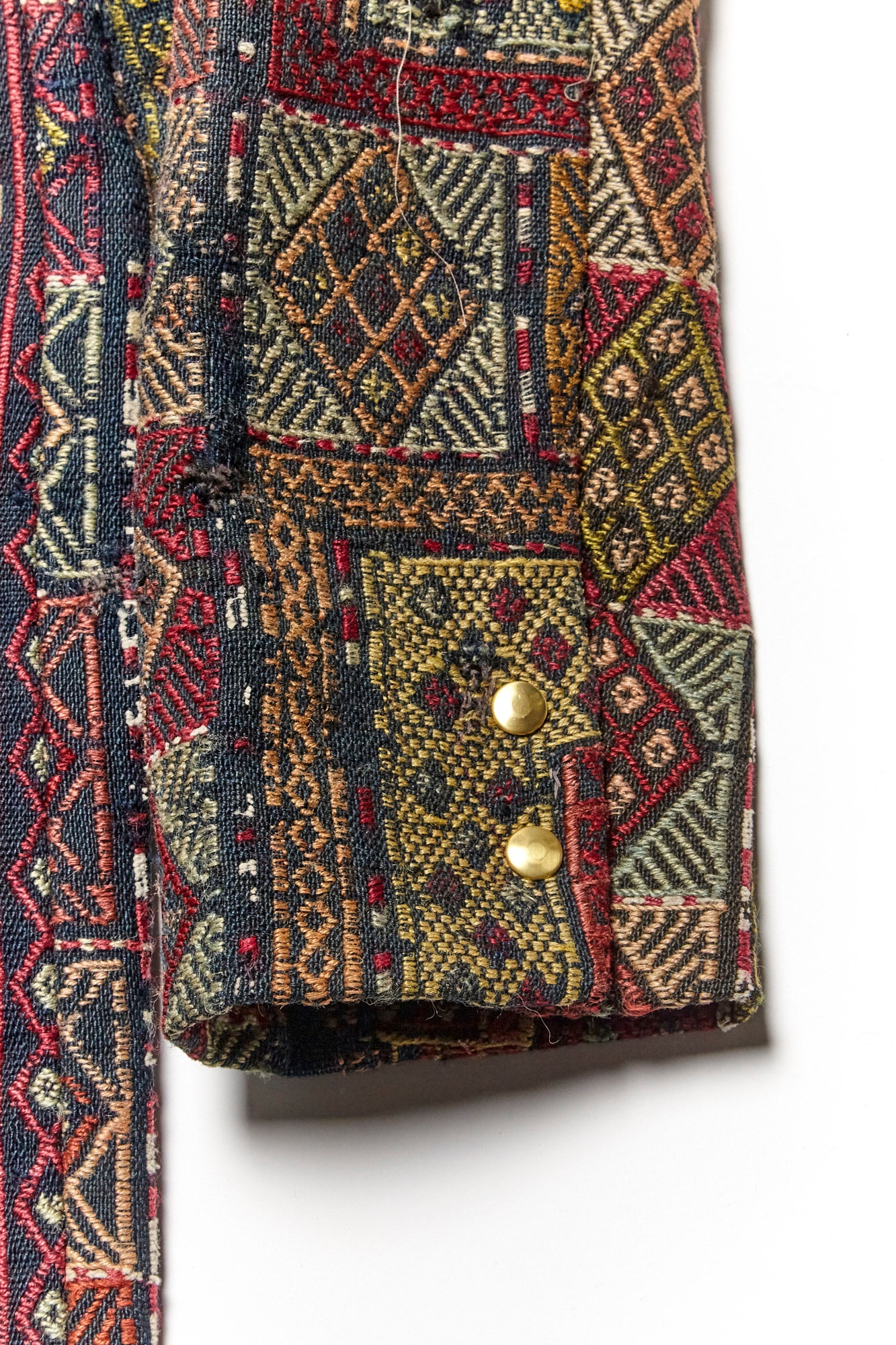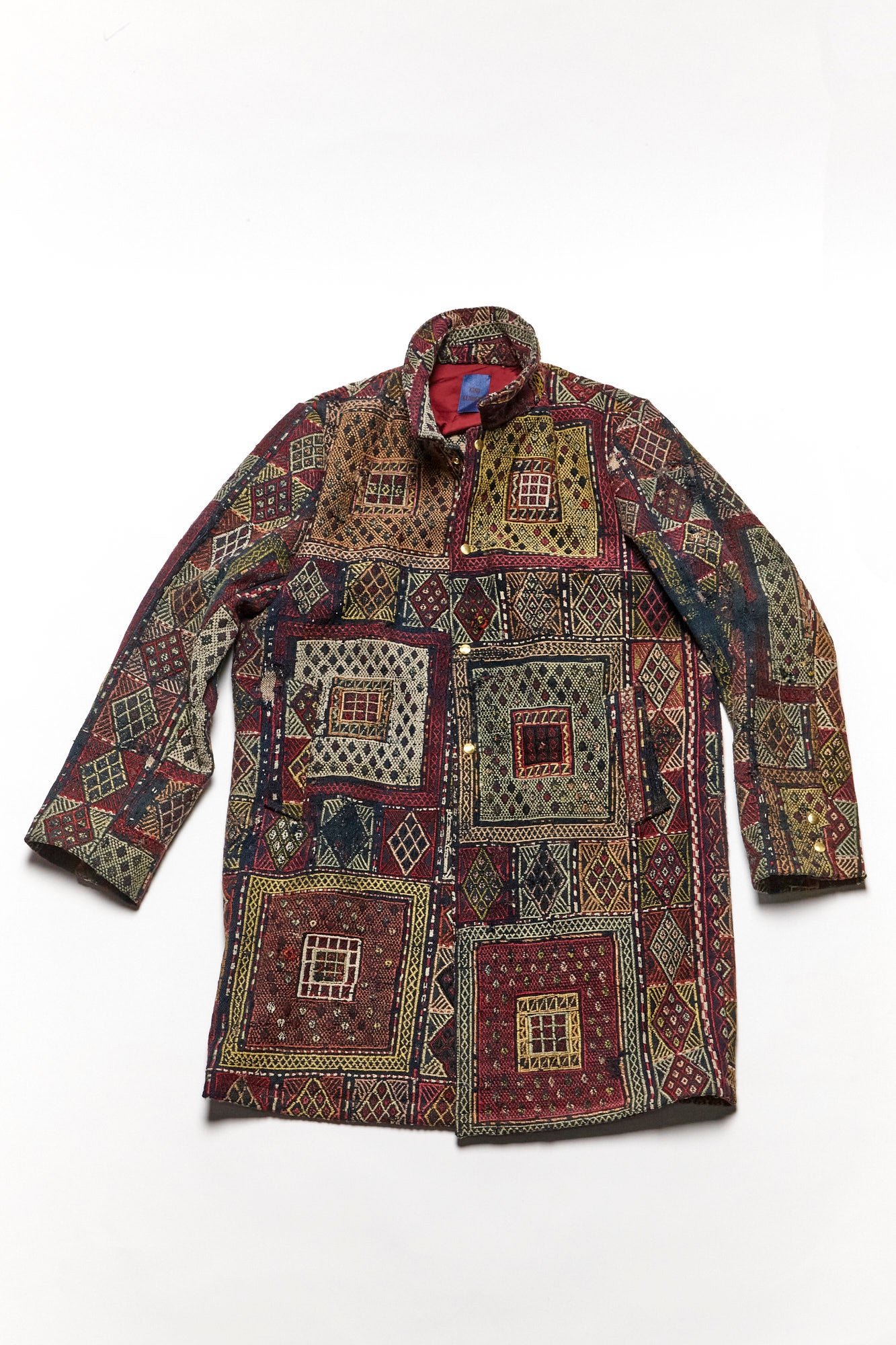 Constructed from an antique rug woven in the early 1900’s and lined with dead stock silk. 3 Pockets, antique brass snap closure.