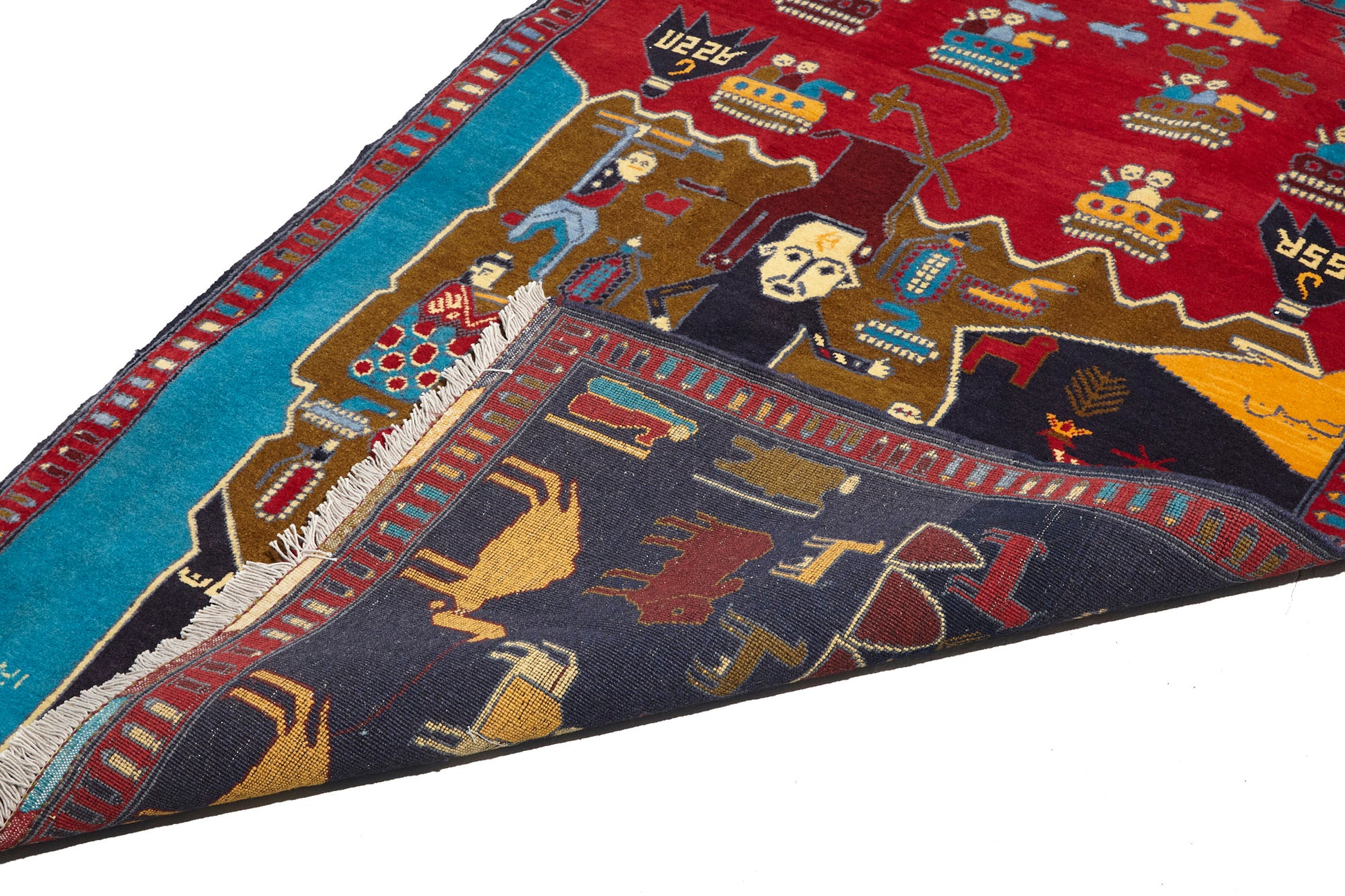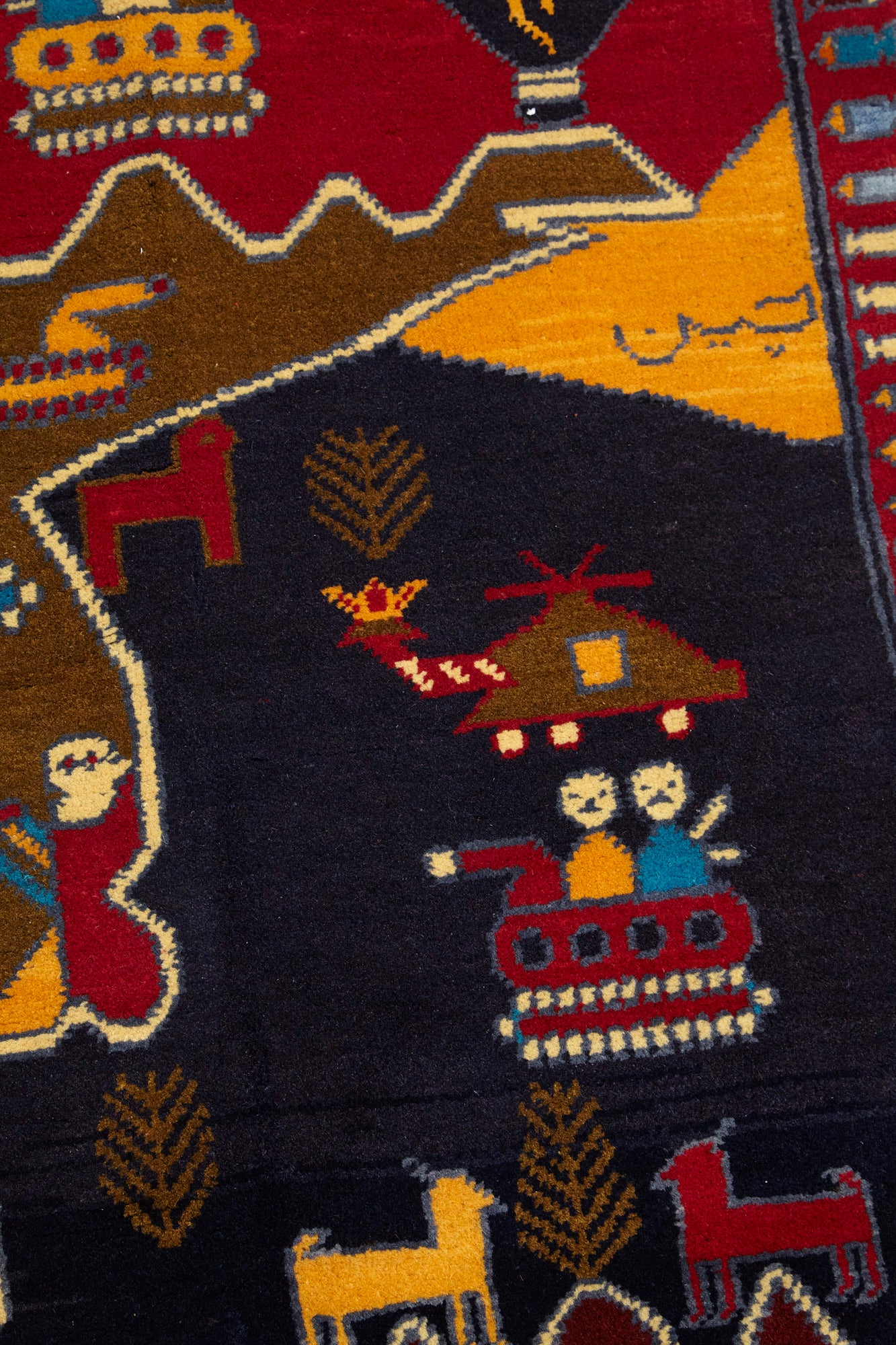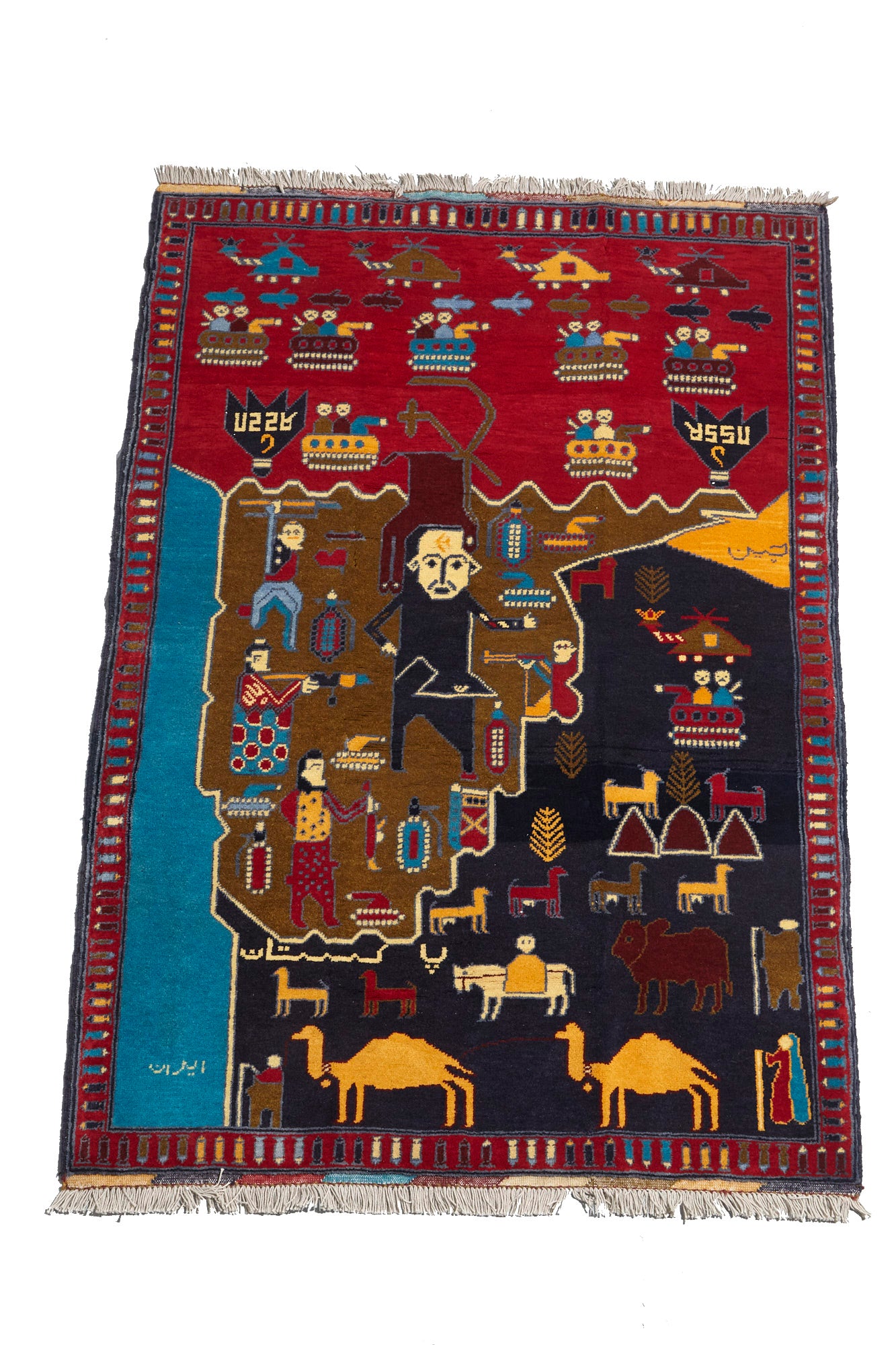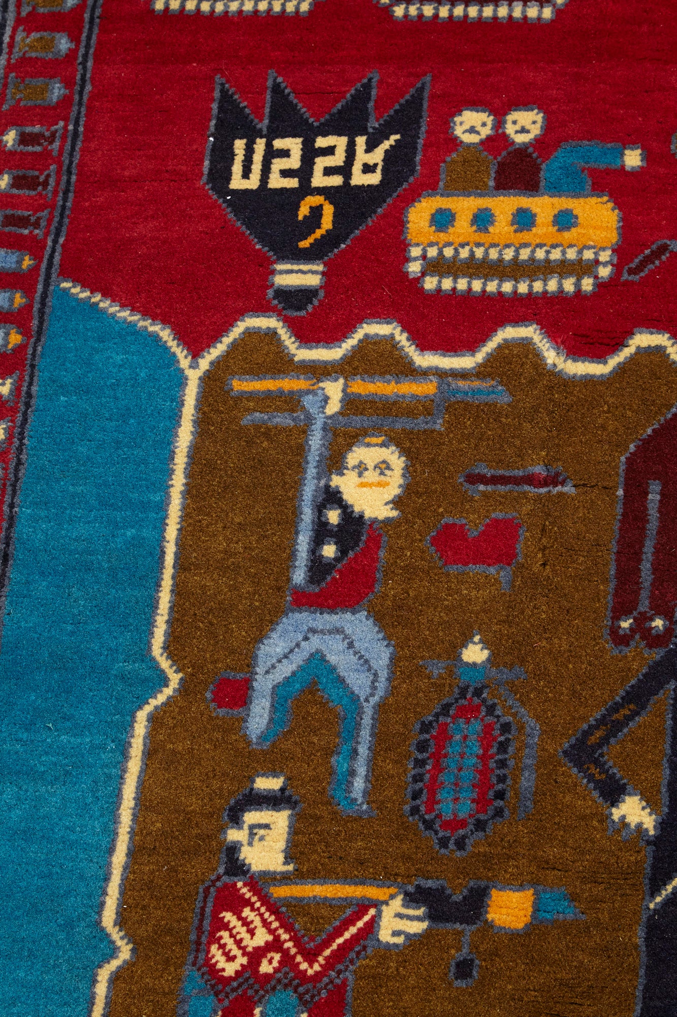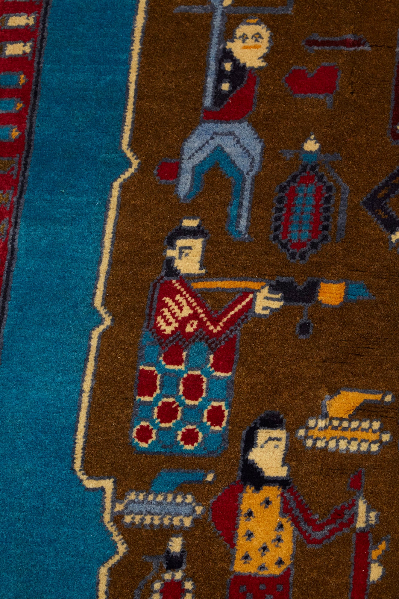 Notes: A modern recreation of the rare Najibullah war rugs depicting civil war. Najib was installed as a puppet leader by the Soviets and was eventually killed and replaced by the Taliban.